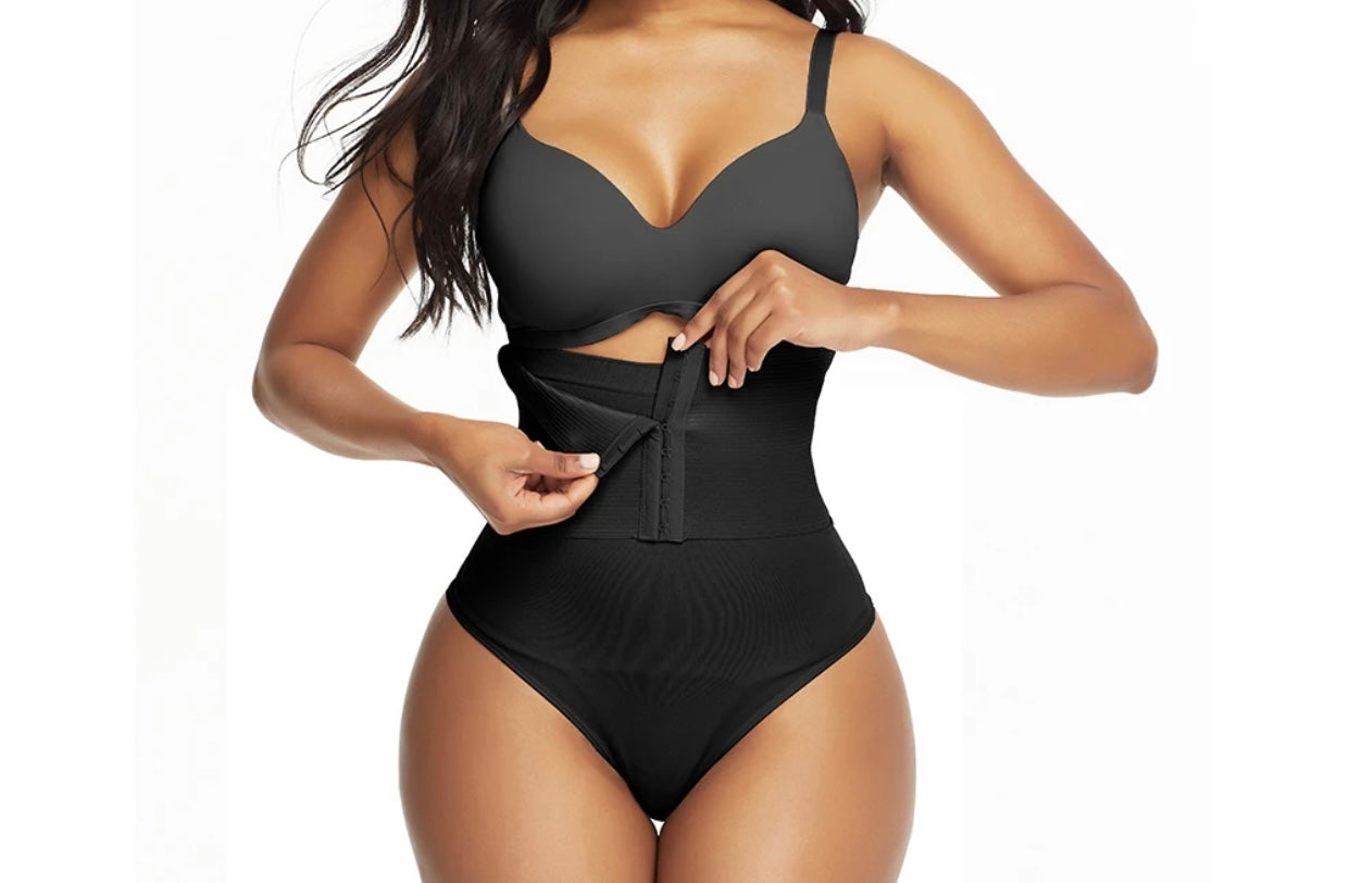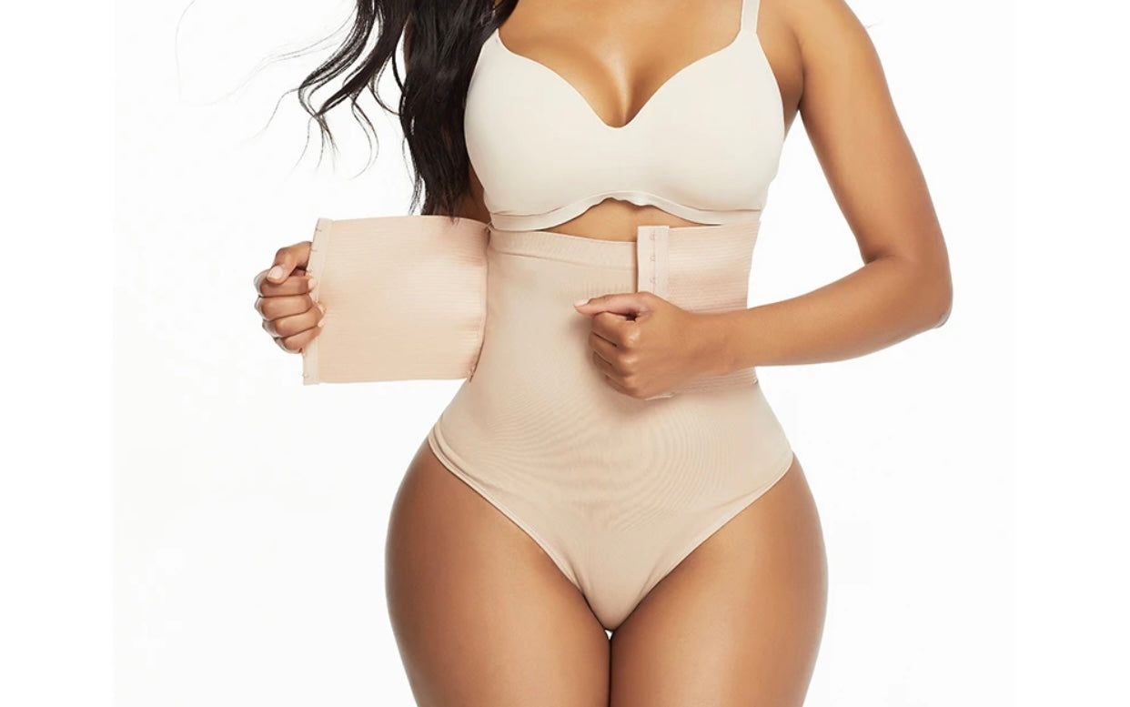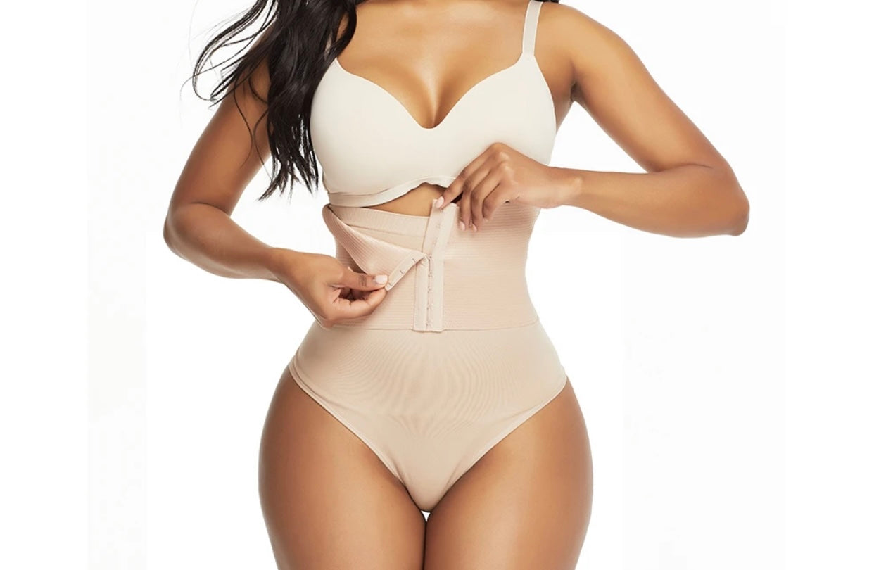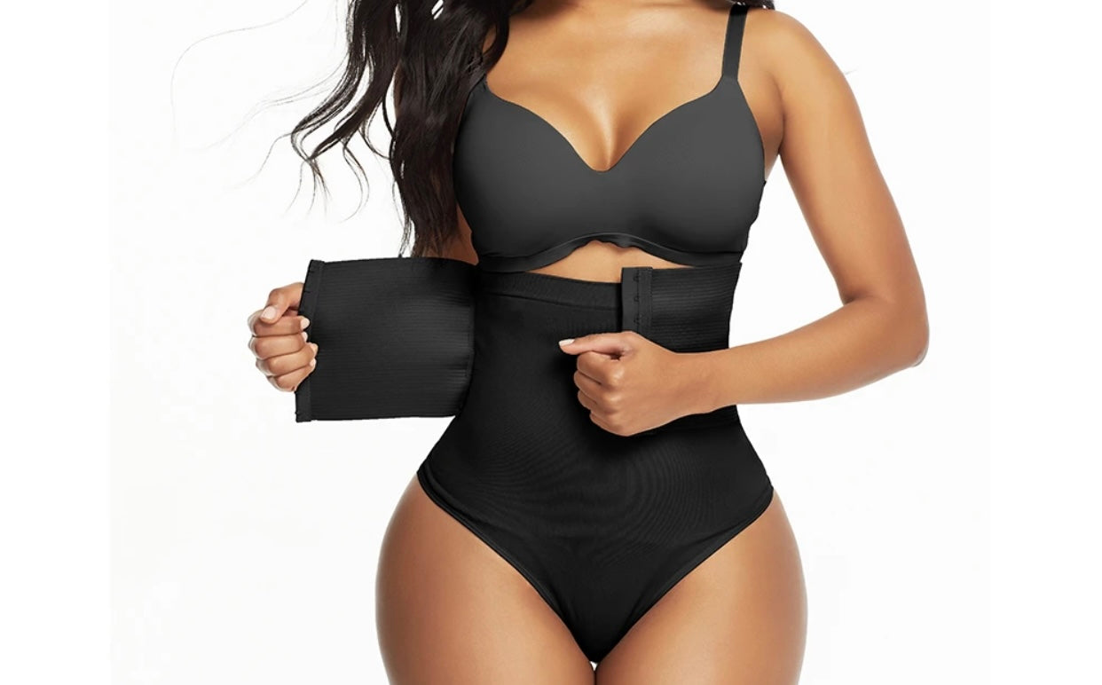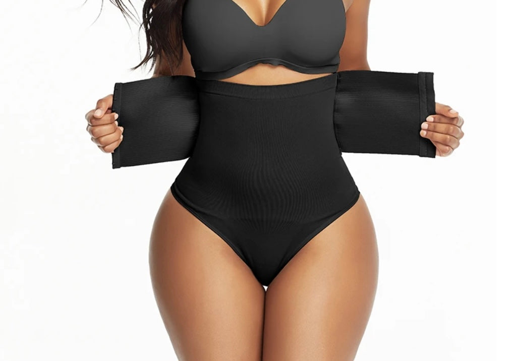High Waist thong panty with eye/hook closure around waist for additional “snatch”. Nylon & spandex fabric so very elastic and comfy to wear!